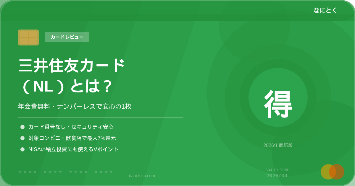 ■ 三井住友カード(NL)の基本情報・年会費:永年無料・ポイント還元率:通常0.5%・国際ブランド:VISA・Mastercard・貯まるポイント:Vポイント・カード番号:券面に記載なし(ナンバーレス)
